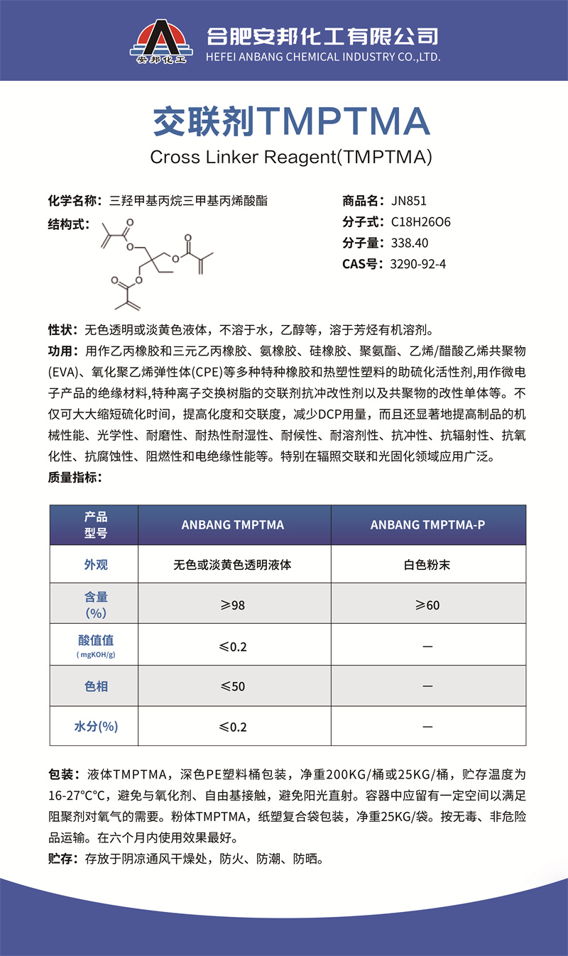聚乙烯、聚丁烯、聚氯乙烯、聚丙烯、聚苯乙烯、CPE和EVA等熱塑性塑料。通過TMPTMA和有機(jī)過氧化物(如DCP等)進(jìn)行熱、光和輻照交聯(lián),不僅可顯著提高交聯(lián)劑制品的耐熱性、耐溶劑性、耐候性、抗腐蝕性和阻燃性,同時(shí)還改善機(jī)械性能和電性能,比單純用DCP交聯(lián)更能改善產(chǎn)品的品質(zhì),消除DCP的異味,減少DCP用量。