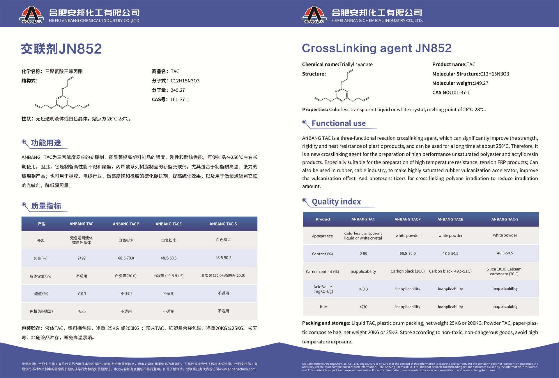 交聯TAC(triallylcyanurate)為三官能度反應的交聯劑,能顯著提高塑料制品的強度、剛性和耐熱性能,可使制品在250℃左右長期使用。因此,它是制備高性能不飽和聚酯,丙烯酸系列樹脂制品的新型交聯劑。