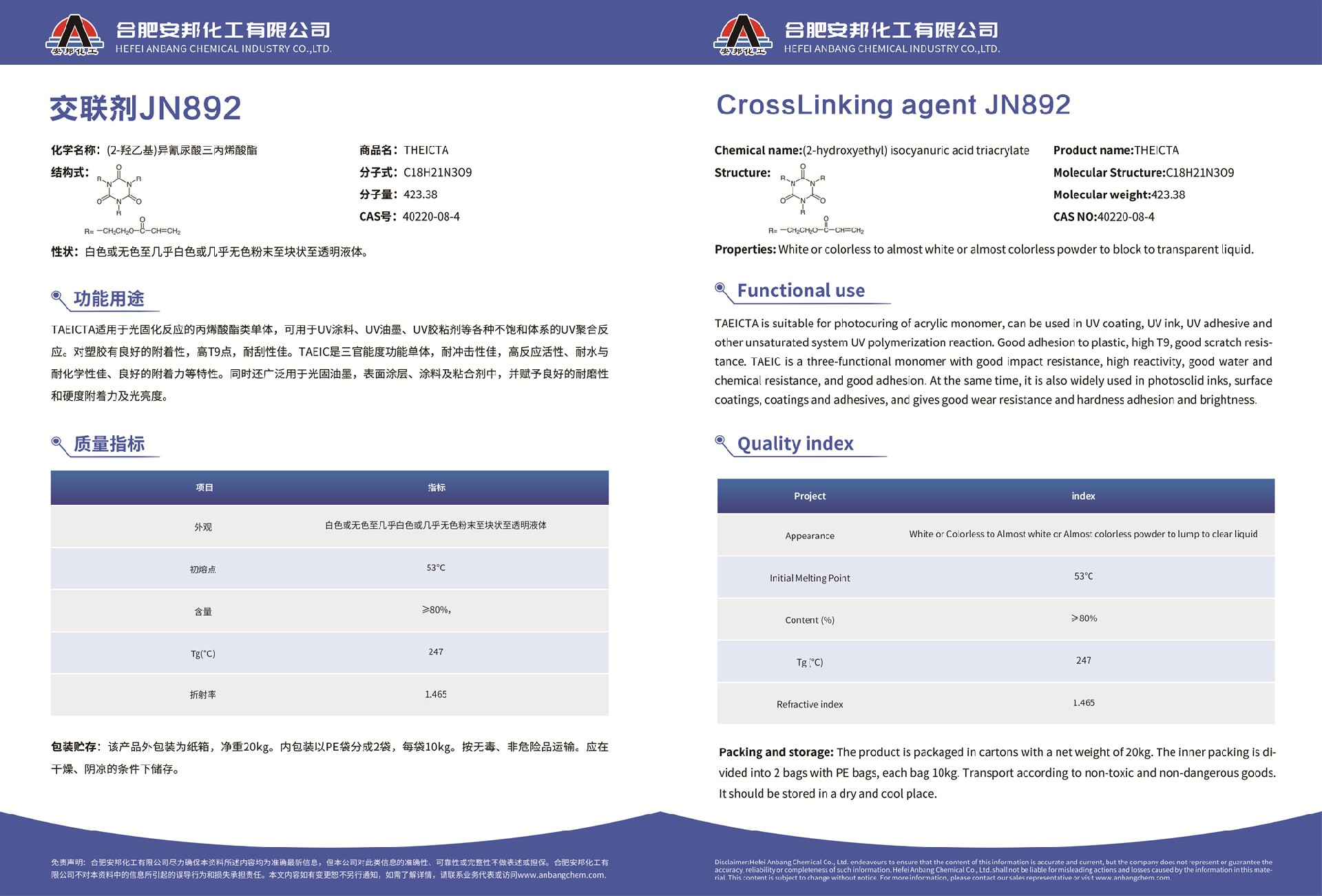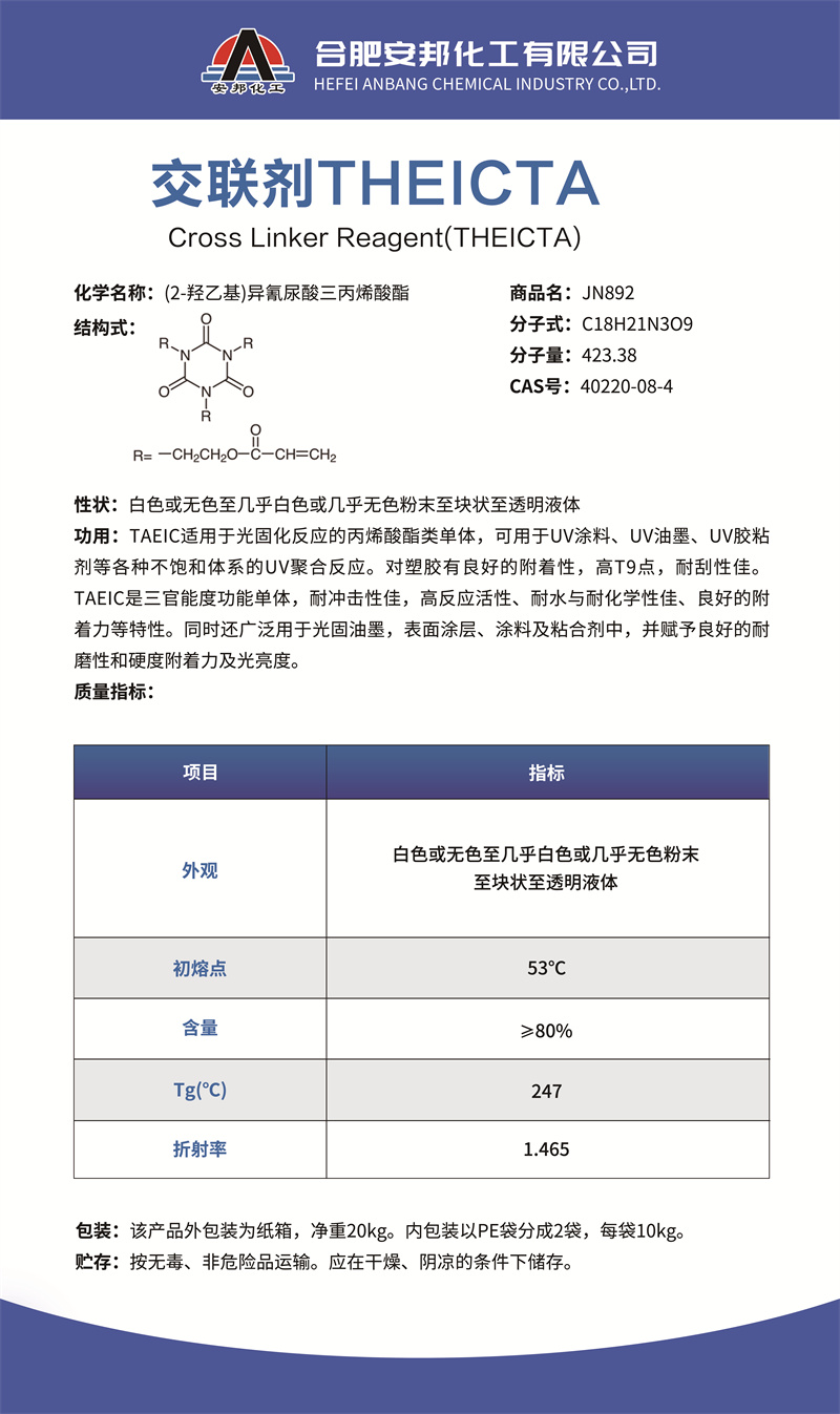 功能用途:TAEICTA適用于光固化反應的丙烯酸酯類單體,可用于UV涂料、UV油墨、UV膠粘劑等各種不飽和體系的UV聚合反應。對塑膠有良好的附著性,高T9點,耐刮性佳。TAEIC是三官能度功能單體,耐沖擊性佳,高反應活性、耐水與耐化學性佳、良好的附著力等特性。同時還廣泛用于光固油墨,表面涂層、涂料及粘合劑中,并賦予良好的耐磨性和硬度附著力及光亮度。